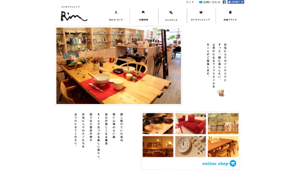 オシャレ家具、雑貨が満載のrinさん。お店の紹介とオンラインショップを兼ね備えています。
